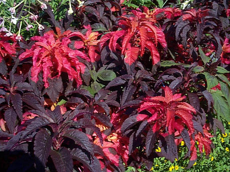 Amaranthus tricolor is grown as a foliage plant for its beautiful multicolored leaves. Equally well-known is its relative, Amaranthus caudatus, known as Love-Lies-Bleeding.