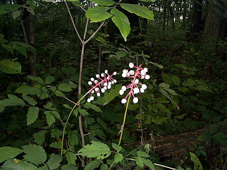 poisonous plant is its tall dark red stalks bearing bright white berries, each with